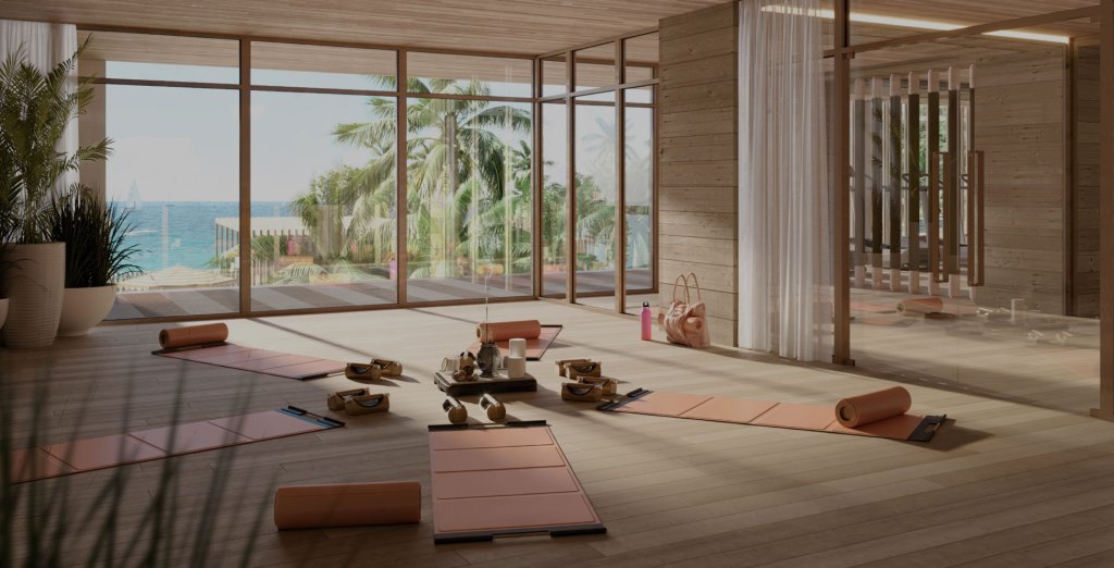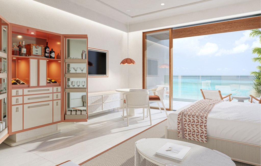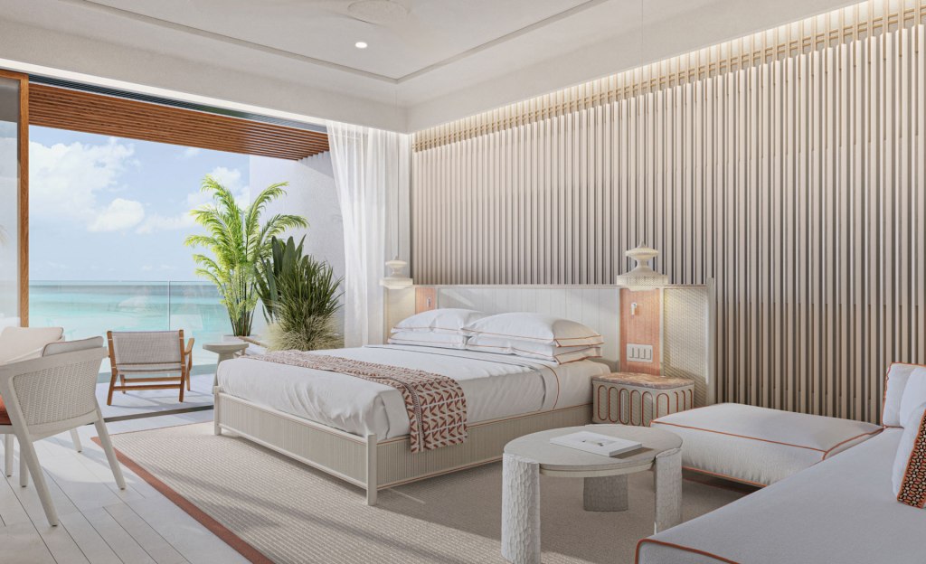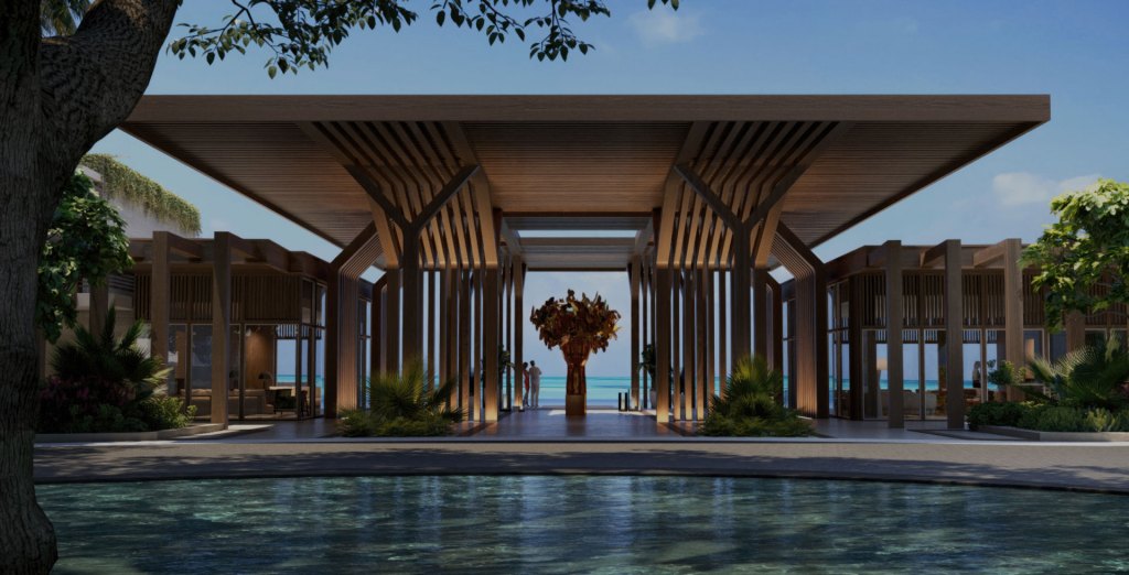 The gated entrance sits 17.5 meters above sea level, creating a commanding sense of arrival, before gently descending to meet the shoreline in a series of cascading terraces that provide breathtaking views from every angle. Striking linear architecture frames a sculptural masterpiece from a renowned international talent, a crown jewel in the dynamic art program that stands out against the dark wood-panelled backdrop and coral stone floors. The reception exudes warmth and relaxed elegance, providing an intimate introduction to the resort.